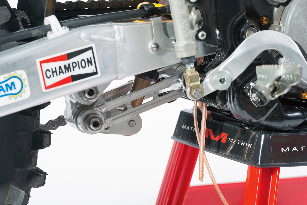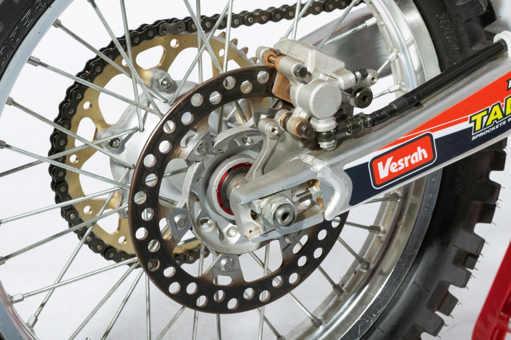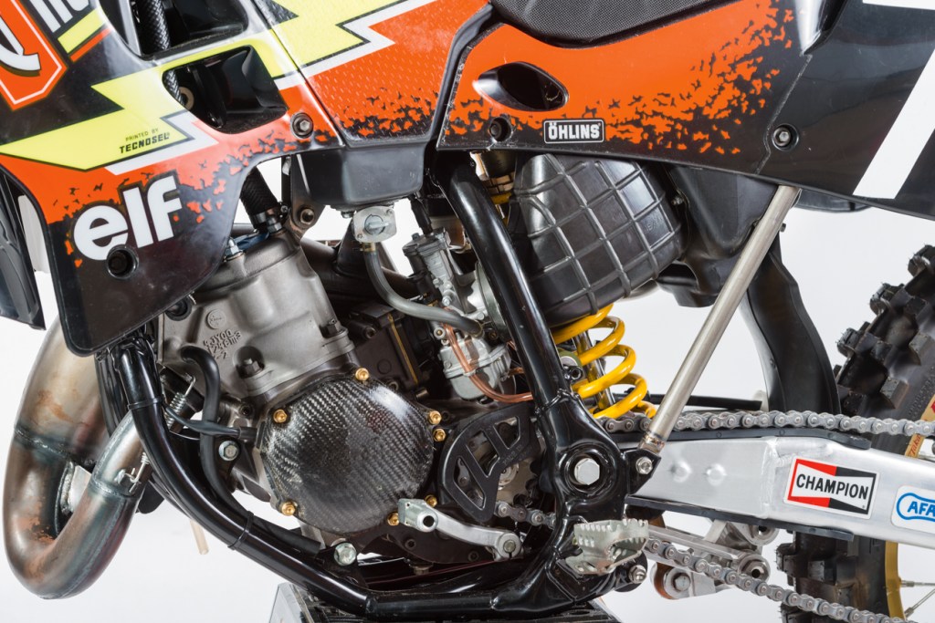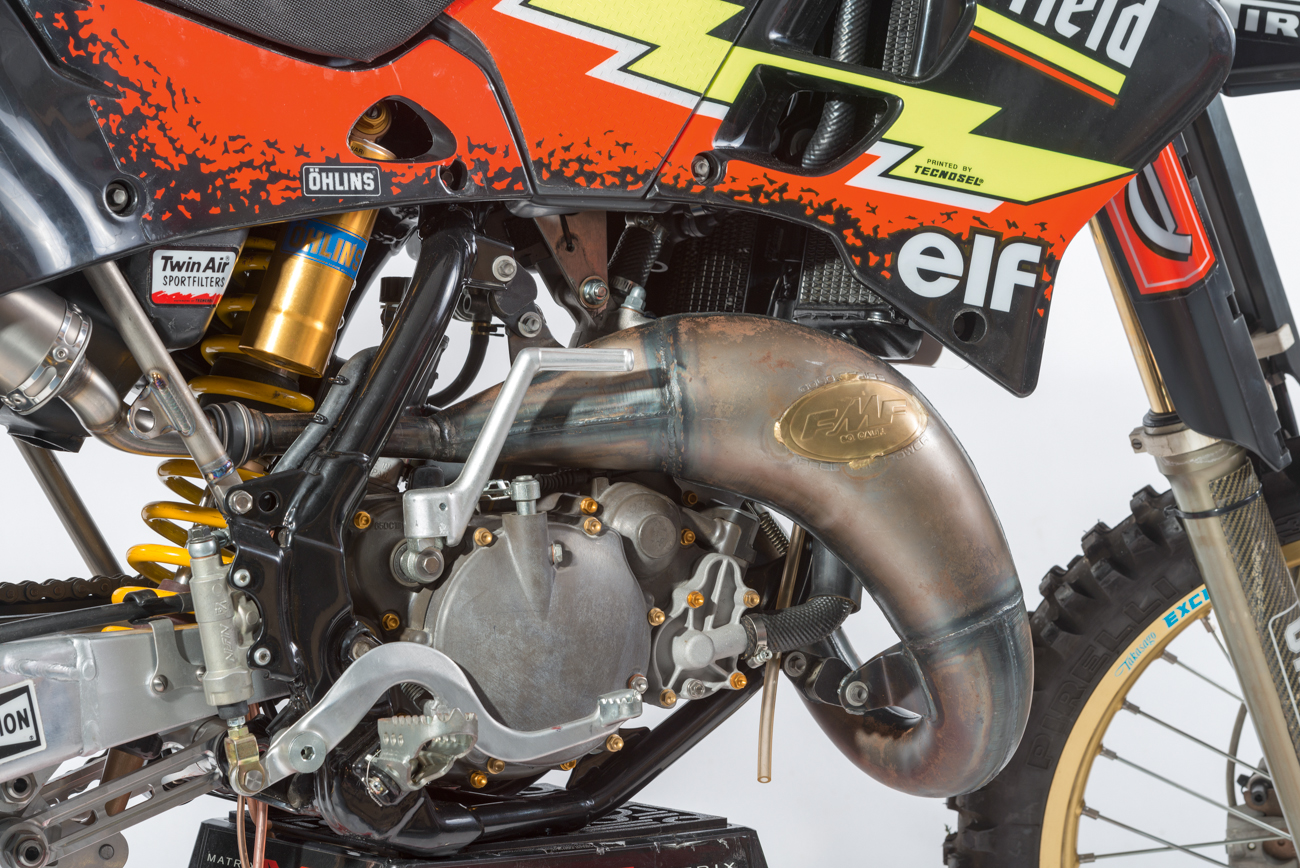 A blokkhoz fejlesztett FMF rendszerrel és a versenyző egyedi igényei szerint módosított hátsó lengővillával lesz teljes a konstrukció, a Tecnosel által tervezett és legyártott Cheserfield-dekor a fekete műanyagokon már csak hab a tortán. 30 év távlatából is vagány külsőt kölcsönöz a motornak, pedig abból az érából származik, amikor bizony nem túl ízléses dekorációs megoldások voltak divatban.