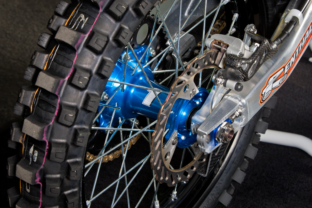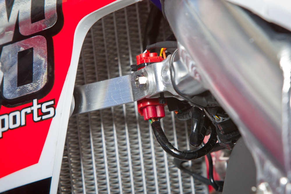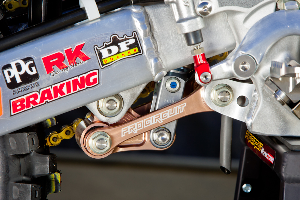 A kezelhetőség kritikus pont, nincs rosszabb supercrosson, mint egy nehezen forduló motor. Más villahidakat hasznának, a villaszöget kisebbre állítják, így az első kerék közelebb kerül a blokkhoz, amivel ugyan romlik az egyenesfutás, de a kanyarodás hatékonyabb lesz. A himba átvariálásával is rásegítenek a gemoetria megváltoztatásához: lejjebb ültetik a hátulját, nagyobb progressziót adva a hátsó rugónak.